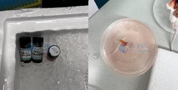 3、小鼠斷頸處死后,取出肝臟部,放入有PBS的培養(yǎng)皿中,放在冰上。